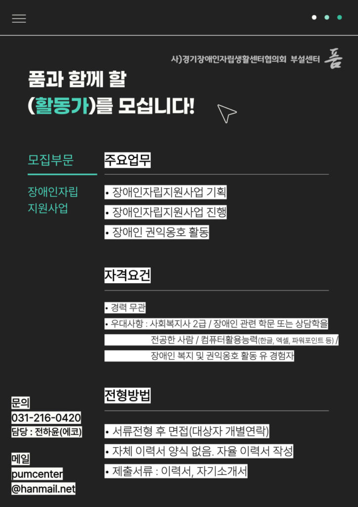 ■ 사)경기장애인자립생활센터협의회 부설센터 “품” 에서 함께할 활동가를 모집합니다.